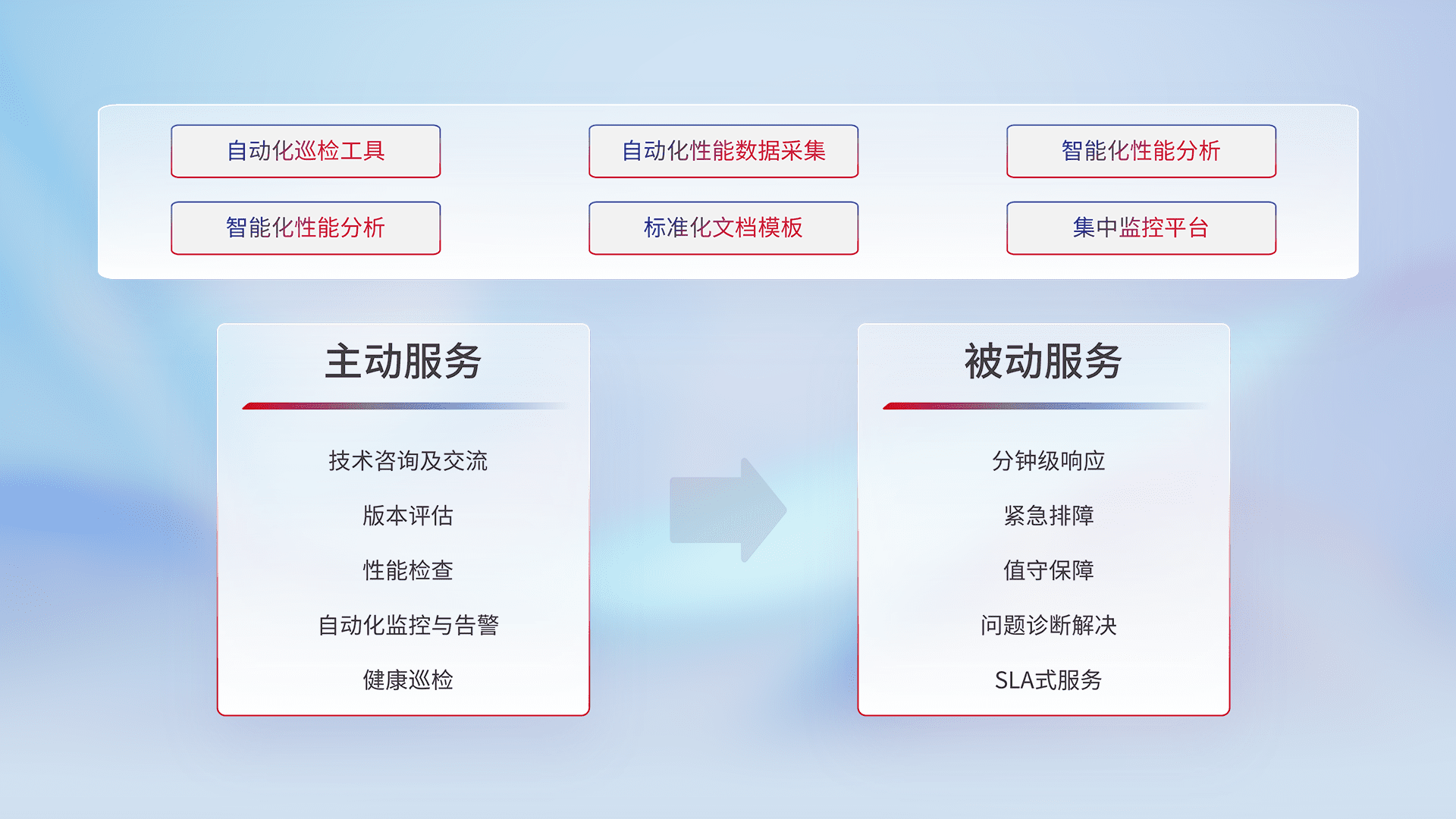 智能化工具和标准化文档,,,保障服务质量,,,,提供主动服务(包含技术咨询、、、、版本评估、、、、性能检查、、自动化监控与告警、、、健康巡检)和被动服务包含(分钟级响应、、紧急排障、、、、值守保障、、、问题诊断解决、、SLA服务)。。。