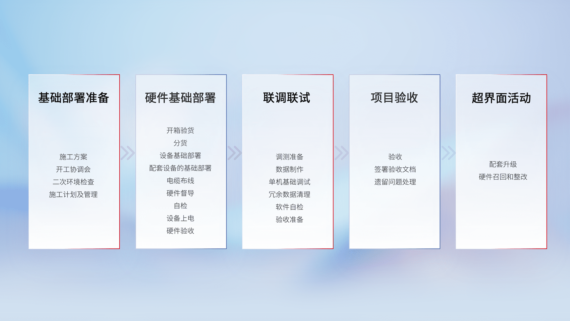 从基础部署准备、、、硬件基础部署、、、联调联试、、项目验收、、、、越界面活动的全过程可追溯,,,保证施工质量和进度。。。